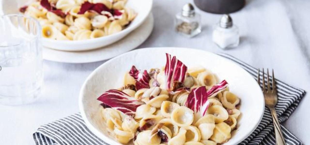 Orecchiette – das sind die teigigen „Öhrchen“, die aus dem Apulien und Basilikata stammen. Dort werden sie vor allem mit Stängelkohl, einem typisch süditalienischen Gemüse, zubereitet. Durch ihre raue Oberfläche und die Wölbung nimmt diese Pasta-Form verschiedenste Soße und Gemüse hervorragend auf und eignet sich deshalb auch perfekt für unsere Gorgonzole-Mascarpone-Walnuss-Soße.